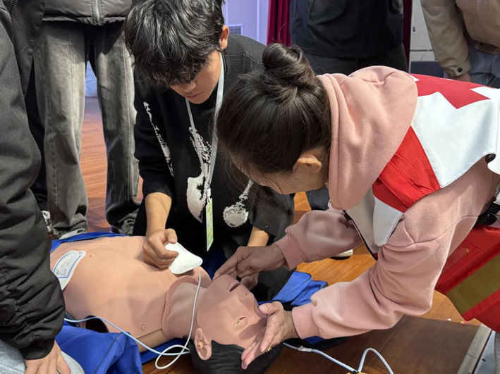 培训中,红十字会讲师聚焦突发情况处置核心要点,重点讲解 AED 正确使用方法,将理论知识与实操场景深度结合。同学们认真聆听、积极互动,主动上手练习急救技巧,现场学习氛围浓厚。