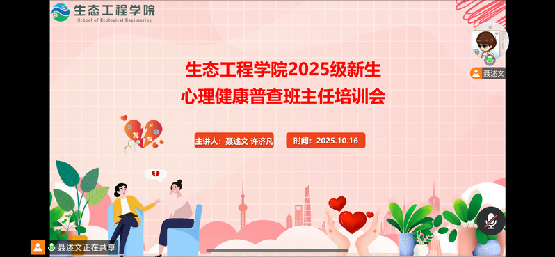 2025年10月16日,生态工程学院通过线上会议形式,组织召开了2025级新生心理健康普查班主任培训会。学院辅导员聂述文、许济凡及全体新生班主任参加本次会议。会议由聂述文老师主讲。