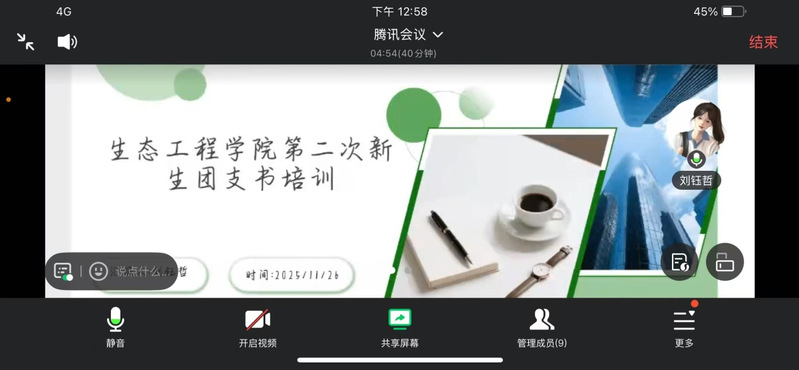 为进一步提升新生团支部书记的业务能力与履职水平,扎实推进基层团组织规范化建设,生态工程学院于11月26日晚通过腾讯会议线上平台,成功举办了本学期第二次新生团支部书记专题培训会。本次培训聚焦基础团务实操,旨在解决新任团支书在工作中遇到的实际问题。学院2025级全体新生团支书参加了培训,学院团委组织部部长刘钰哲同学担任主讲人。
